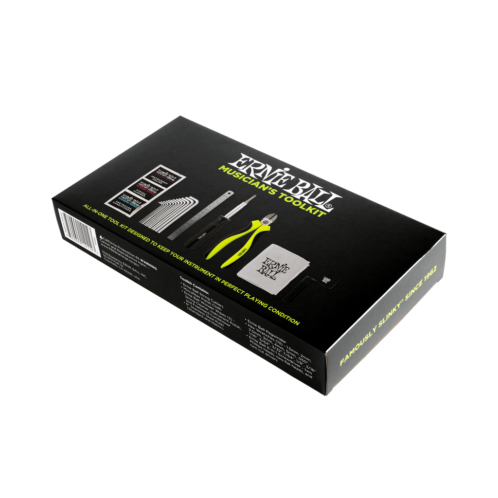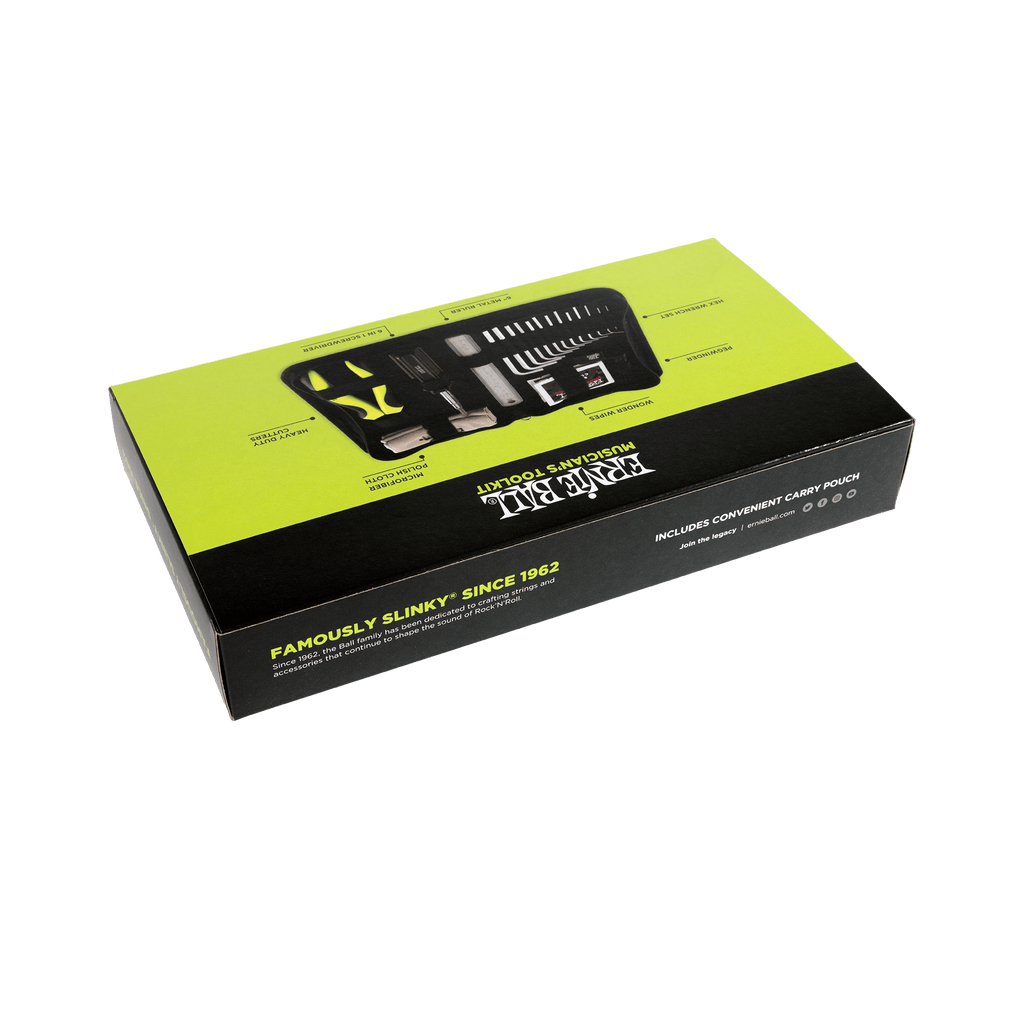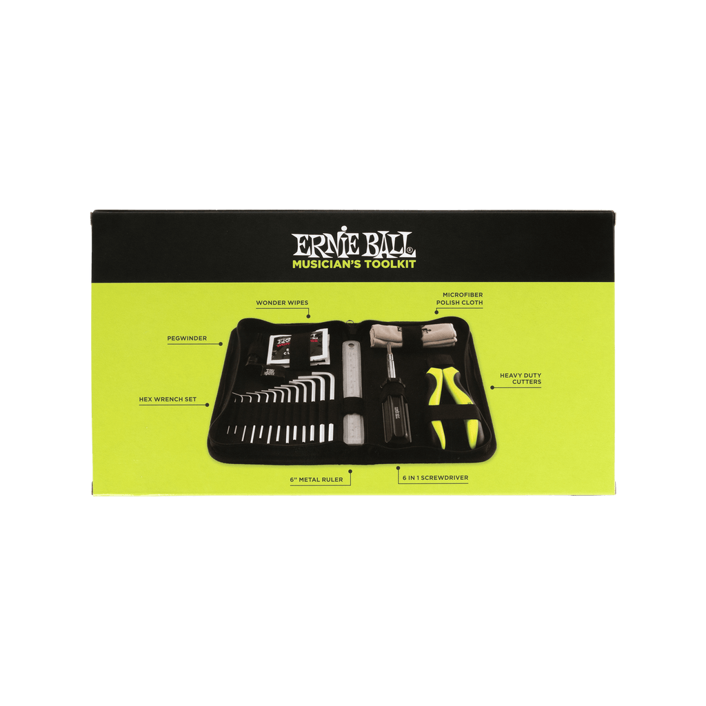 Ernie Ball's all in one tool kit is perfect for cleaning, maintaining and keeping your instrument in perfect playing condition. Change strings, set intonation, adjust the action, check string height and more. Tool kit includes Microfiber Polish Cloth, Wonder Wipes, Heavy Duty String Cutter, Peg Winder, 6-in-1 Screwdriver, Ruler, and durable Hex Wrench Set.